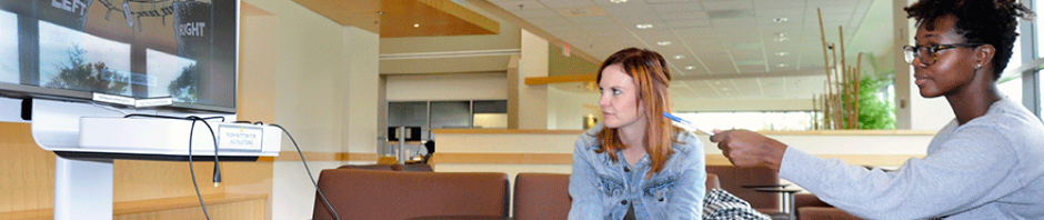 Students, faculty, and staff who want to collaborate on a document, project or paper can use the MediaScape. Laptops, tablets and smartphones can connect simultaneously and with a click of a “puck” switch between users to share notes, media and websites. The MediaScape is portable and can be used anywhere in the library, including a group study room. A variety of cables are available to allow connection of different devices.