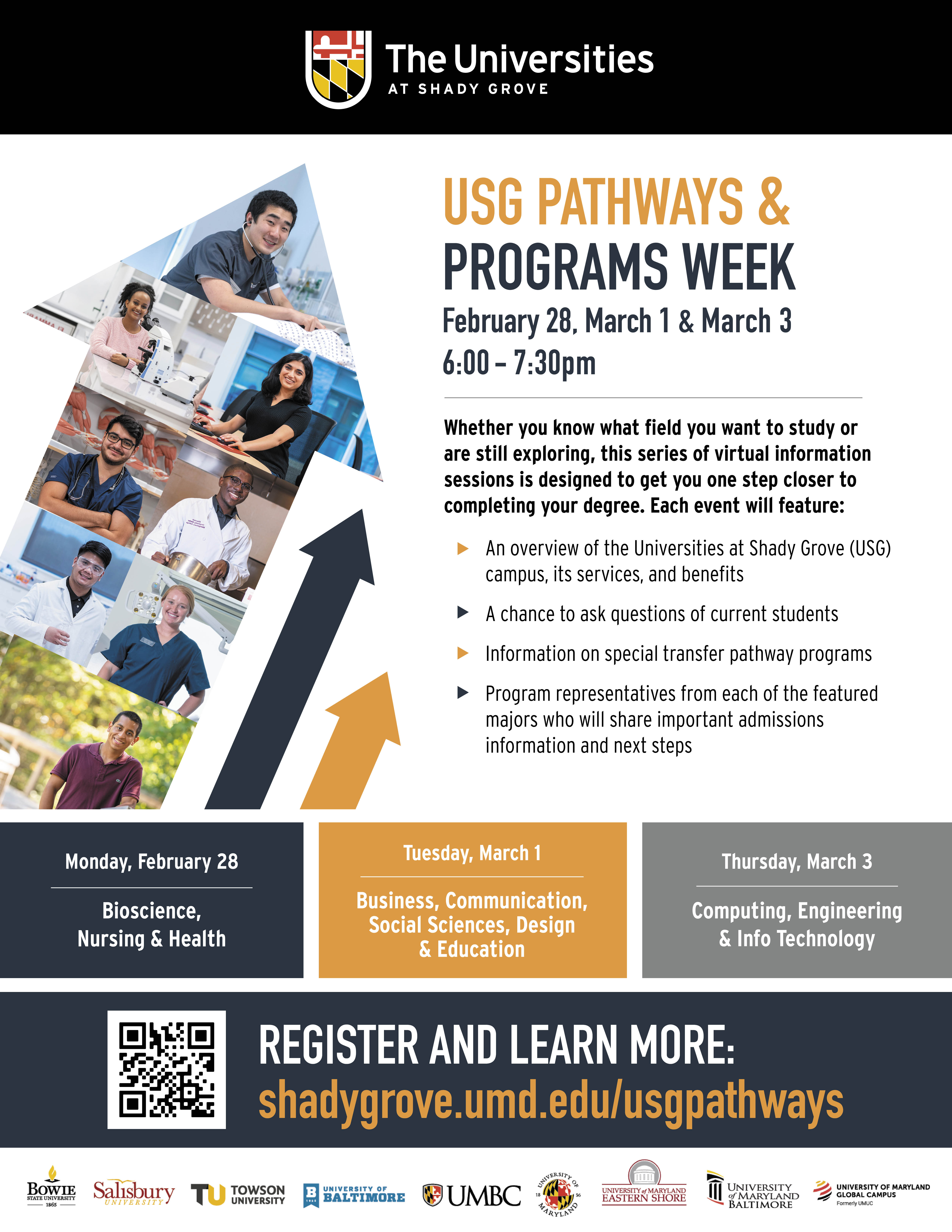 Deciding which path is right for you can be hard. Especially, when there are so many options to choose from. As you explore what’s next in your journey, I invite you to attend USG’s upcoming Pathways and Programs Week, Feb 28-Mar 3, to learn more about the Universities at Shady Grove and the expansive selection of majors offered by the nine Maryland universities on our campus. Whether you know exactly what you want to study or you’re still figuring it out, this series of virtual information sessions will help you get you one step closer to completing your degree.