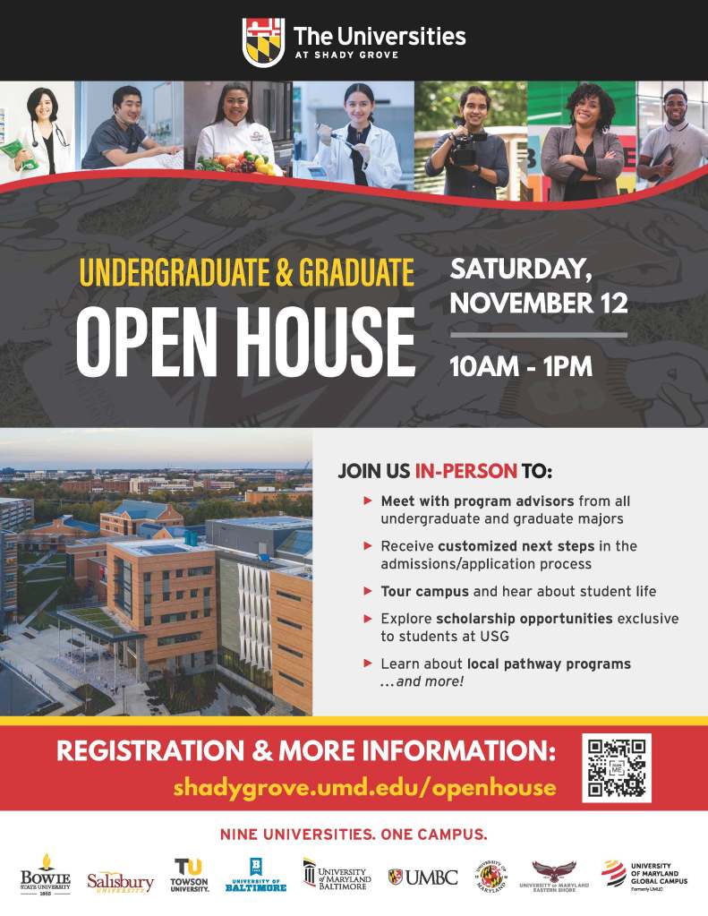 The USG Open House will provide high school through graduate-level attendees a chance to explore all degree programs offered at USG from our 9 partner universities, as well as learn about scholarships, take campus tours, explore student life, and get customized next steps. More information and registration can be found at shadygrove.umd.edu/openhouse.